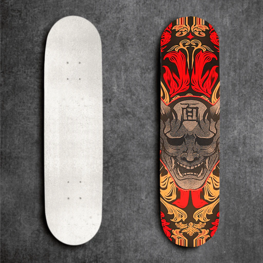 Dive into the world of skate art with our Demon Skateboard Wall Art! This stunning piece showcases a fierce demon face mask, brought to life with vivid black shades against a fiery background of red, yellow, and orange. Crafted from durable acrylic, it's the perfect way to add a pop of color and edge to your space. Ideal for those looking to buy skateboard-inspired decor or searching for a unique addition to their collection.
